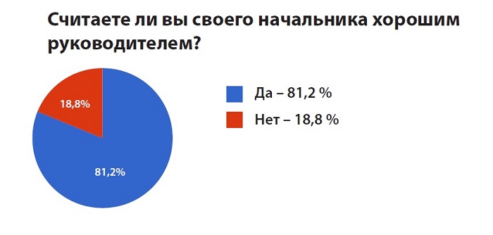 Большинство сотрудников считают своих начальников хорошими руководителями - 81,2% опрошенных. При этом 83,4% респондентов не сомневаются в справедливости их решений.