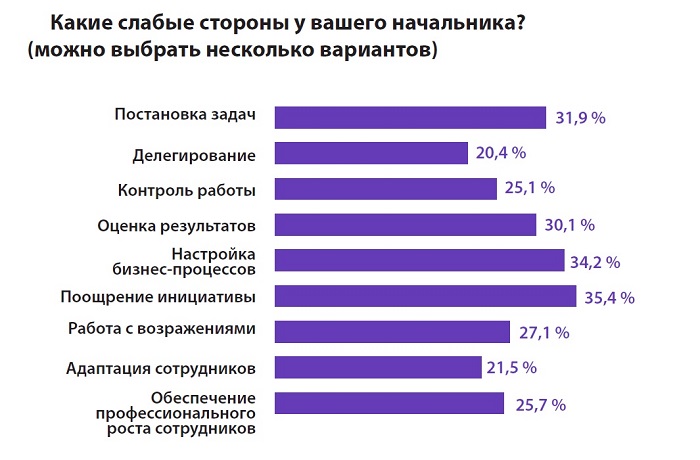 Главные слабые стороны российских руководителей – это отсутствие системы поощрения инициативы (35,4%) и неправильная настройка бизнес-процессов (34,2%). Однако 80,6% опрошенных все-таки отмечают, что поощрение инициативных сотрудников в их компаниях встречается.